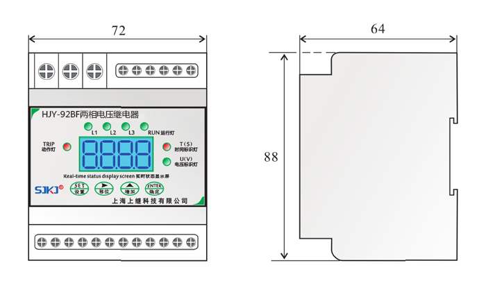 , 無(wú)數(shù)值顯示。繼電器達(dá)到所設(shè)定值,動(dòng)作后,由TIRP動(dòng)作燈會(huì)點(diǎn)亮,實(shí)際線路電壓低于或高于所設(shè)定的返回值,指示燈切換回來(lái)。正常運(yùn)行情況下,RUN運(yùn)行燈、電壓設(shè)置表示燈常亮。L1、L2、L3來(lái)回切換運(yùn)行。當(dāng)輸入電壓任意一相滿足動(dòng)作條件,繼電器動(dòng)作,電壓標(biāo)識(shí)燈熄滅,表示延時(shí)時(shí)間已到動(dòng)作。當(dāng)輸入接近動(dòng)作條件時(shí),繼電器進(jìn)入動(dòng)作預(yù)備狀態(tài),所有芯片資源用來(lái)計(jì)算輸入值,一旦滿足條件,立即啟動(dòng)計(jì)時(shí),繼電器設(shè)有啟動(dòng)量連續(xù)判斷功能和突變量連續(xù)判斷功能,能夠有效迅速的判斷輸入值,并躲過(guò)短時(shí)干擾。HJY-92BF兩相欠電壓繼電器接線圖