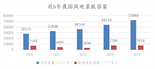 截至2024年末,全國風(fēng)電累計并網(wǎng)容量達(dá)到5.21億千瓦,同比增長18%,其中陸上風(fēng)電4.8億千瓦,海上風(fēng)電4127萬千瓦,在全國電力裝機中排在第3位。全年新增裝機容量7982萬千瓦,同比增長6%,其中陸上風(fēng)電7579萬千瓦,海上風(fēng)電404萬千瓦。從新增裝機分布看,“三北”地區(qū)占全國新增裝機的75%。2024年,全國風(fēng)電發(fā)電量9916億千瓦時,同比增長16%,僅次于火電和水電,排在第3位;全年并網(wǎng)發(fā)電利用小時數(shù)為2127小時,平均上網(wǎng)利用率95.9%。