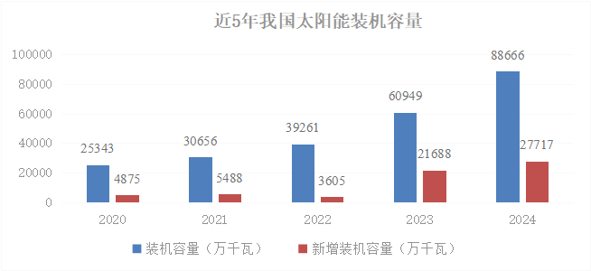 截至2024年末,全國光伏發(fā)電裝機容量達(dá)8.86億千瓦,同比增長45%,排在火電之后,位居第2位,其中集中式光伏5.11億千瓦,分布式光伏3.75億千瓦。全年光伏新增裝機2.78億千瓦,同比增長28%,其中集中式光伏1.59億千瓦,分布式光伏1.18億千瓦。全年光伏發(fā)電量達(dá)到8341億千瓦時,同比增長44%,但仍落后于核電的發(fā)電量,排在第5位。全年發(fā)電利用小時數(shù)為1211小時,發(fā)電上網(wǎng)利用率96.8%,較上年有所降低。