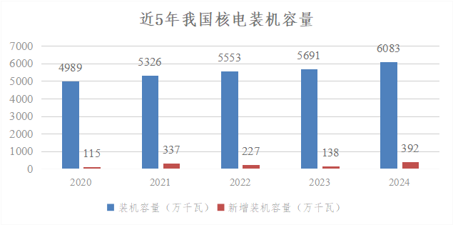 2024年是我國核電發(fā)展具有里程碑的一年,全年新核準(zhǔn)11臺核電機組,為歷年核準(zhǔn)數(shù)量之最,連續(xù)3年核準(zhǔn)機組數(shù)量超過10臺;投入運行核電機組2臺,新增額定裝機規(guī)模240萬千瓦;在運、在建和核準(zhǔn)待建核電機組共有102臺,總裝機容量1.13億千瓦,連續(xù)2年位居全球首位。截至當(dāng)年末,全國運行核電機組共有57臺(不含臺灣地區(qū)),額定裝機容量為5943.17萬千瓦。全年累計核電發(fā)電量為4451.75億千瓦時,比上年同期上升了2.72%,占全國累計發(fā)電量的4.73%,超過太陽能發(fā)電量,排在第4位。由此可見,我國核電裝機占全國總裝機的比例不到2%,但發(fā)出的電量接近全國總發(fā)電量的5%。年設(shè)備利用小時數(shù)為7805.74小時,平均機組能力因子為90.26%。