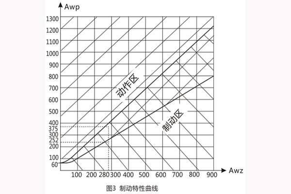 4.由動(dòng)作電流與制動(dòng)電流的比值所決定的制動(dòng)系數(shù)Kz可以在廣泛的范圍內(nèi)變化,圖3的制動(dòng)特性AWp=f(AWz)是其極限范圍,它與工作電流濟(jì)口制動(dòng)電流間的相位角有關(guān),但無論在任何角下都不應(yīng)越出曲線的范圍。