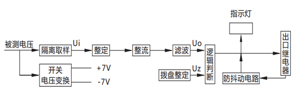 被測電壓經過電阻分壓取樣,得到與被測電壓成比例的取樣電壓Ui,Ui經撥盤整定,再進行整流濾波,得到直流Uo,邏輯回將Uo 與門坎電壓Uz進行比較。對欠電壓繼電器,若Uo>Uz,則出口繼電器不動作;若Uo<Uz,則出口繼電器動作。對過電壓繼電器,若 Uo<Uz,則出口繼電器不動作;若Uo>Uz,則出口繼電器動作。