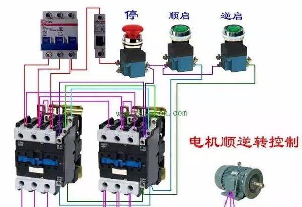 上圖是電機(jī)正反轉(zhuǎn)控制的典型應(yīng)用,大家看到,斷路器起到了保護(hù)電氣過電流、過電壓等作用,但接觸器則根據(jù)不同的啟動(dòng)信號,接通線圈以后來控制電機(jī)的工作。